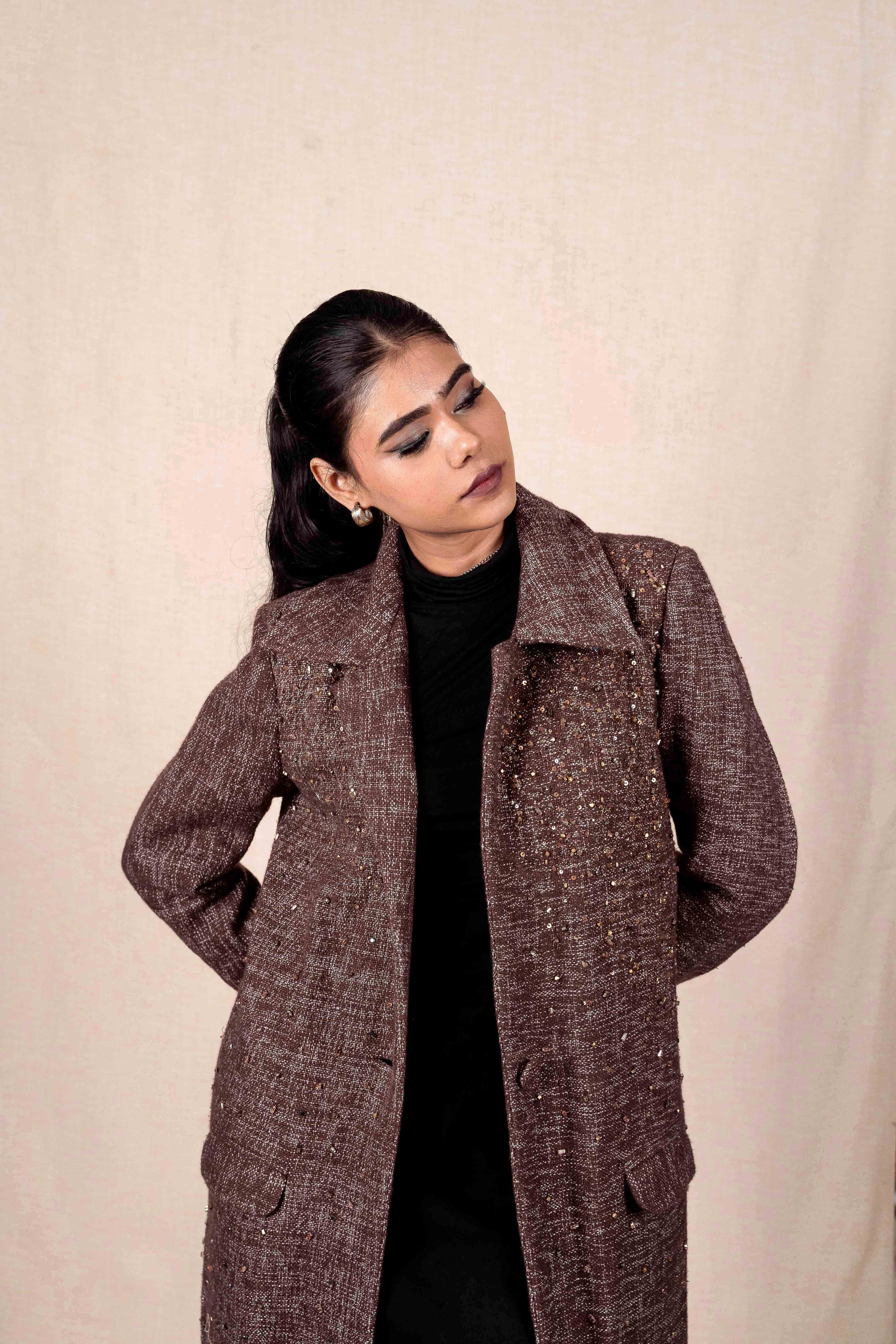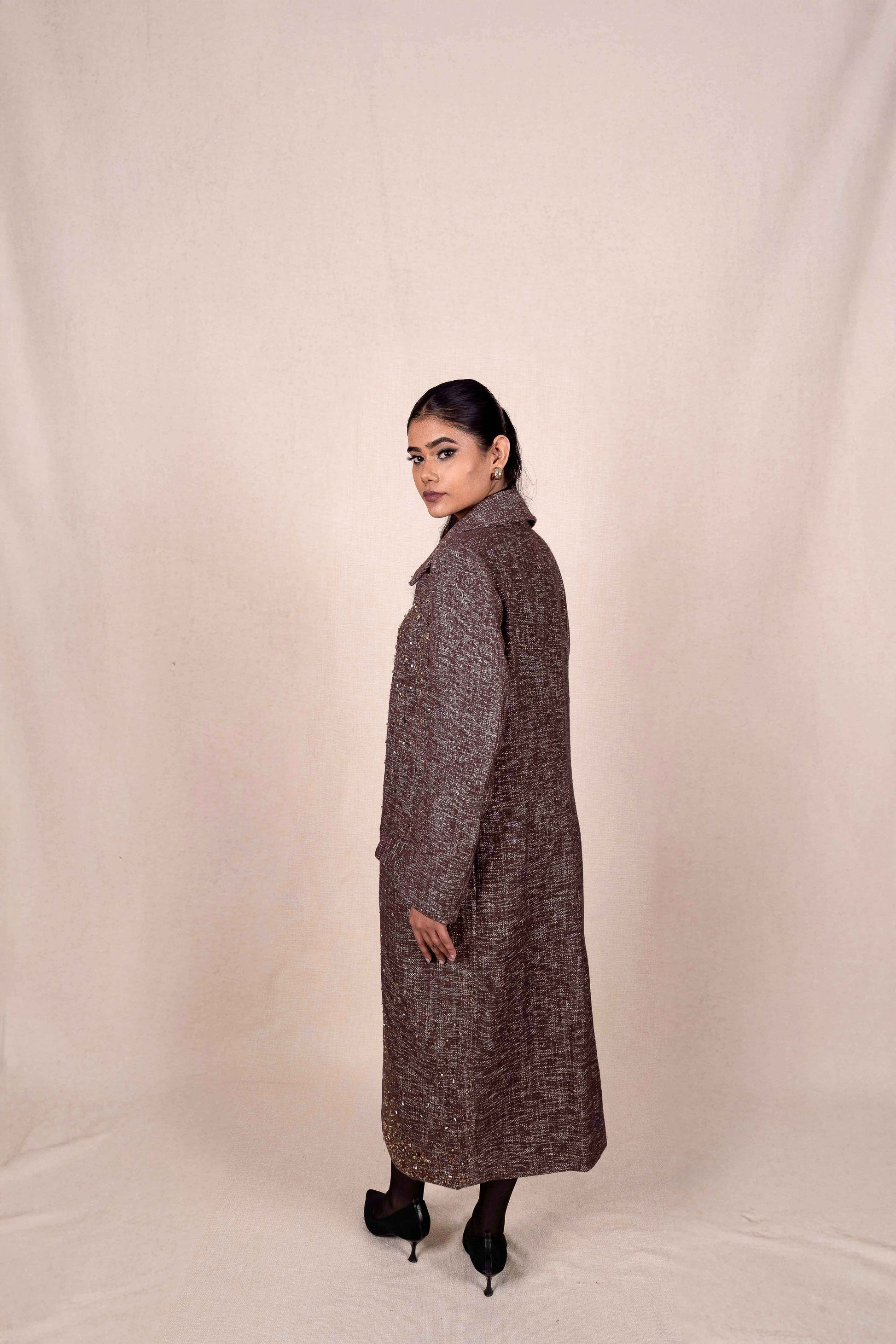 A long, elegant cocoa coat that blends warmth with subtle radiance. The textured weave is scattered with hand-embroidered details, creating a soft shimmer that moves gently with the body. Structured shoulders, a refined collar, and clean lines give the silhouette a quiet authority β timeless, grounded, and luminous in its restraint.