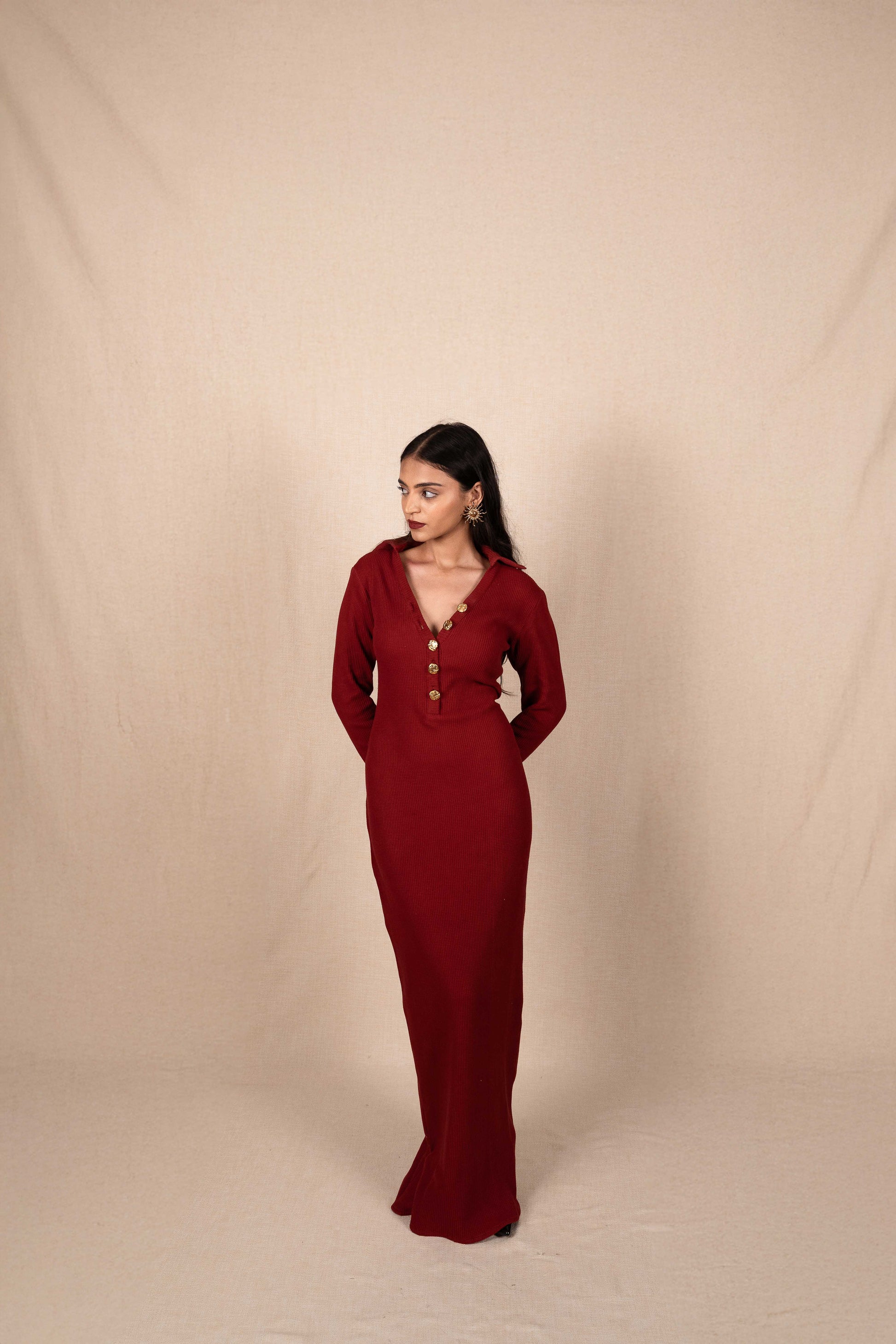 A warm, sculpted silhouette in deep rust, this thermal knit dress feels like soft architecture on the body. The ribbed texture adds gentle structure, while the gold buttons allow the neckline to be adjusted — from modest to softly undone. Minimal, refined, and deeply grounding.