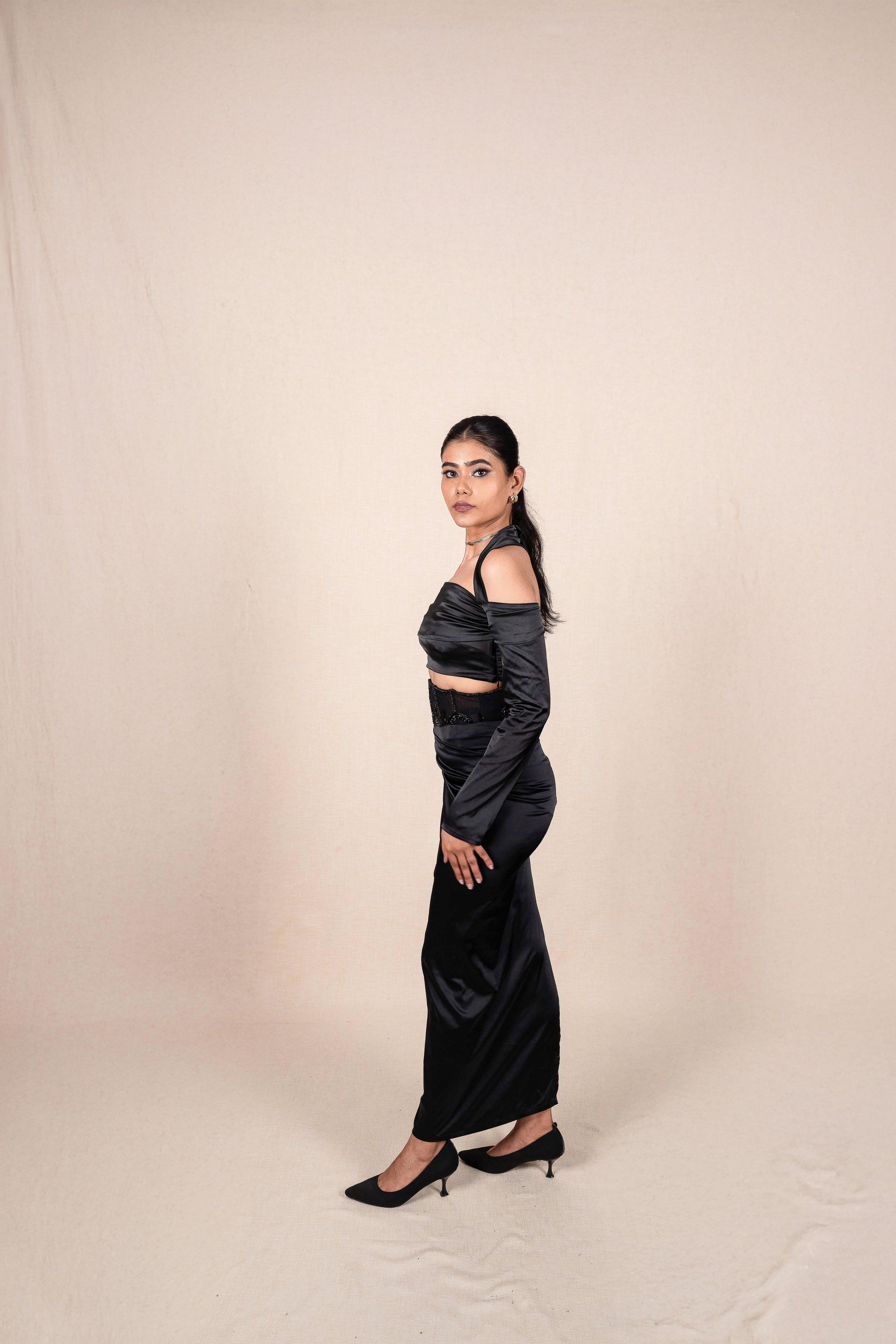 A sleek black co-ord set designed with sculpted elegance and modern sensuality. The asymmetric draped top features an off-shoulder sleeve paired with a structured neckline strap, creating a bold yet refined silhouette. The skirt falls in a smooth, body-hugging drape, cinched with a sheer embroidered corset that adds texture, definition, and a touch of dark romance.